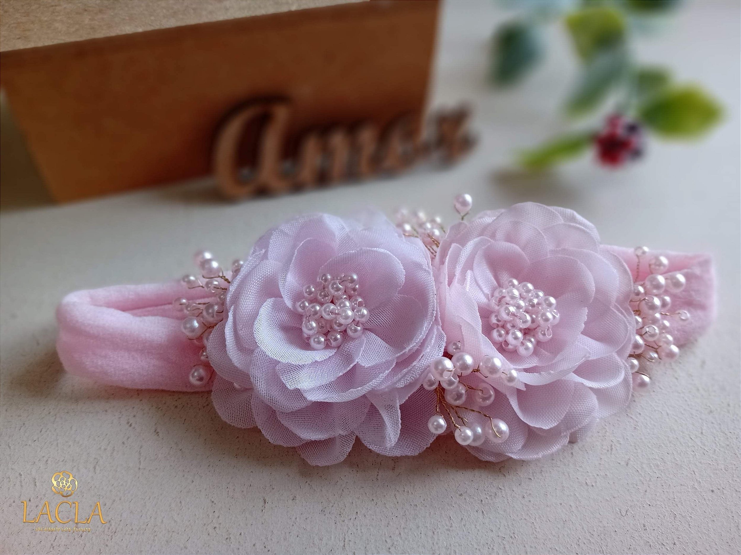A Faixa Lindeza tem flores de tecido com uma leve diferença de tons de rosa bebê. Tem os miolos e os raminhos suspensos cheio de bordadinhos de mini pérolas rosas. É muita riqueza!